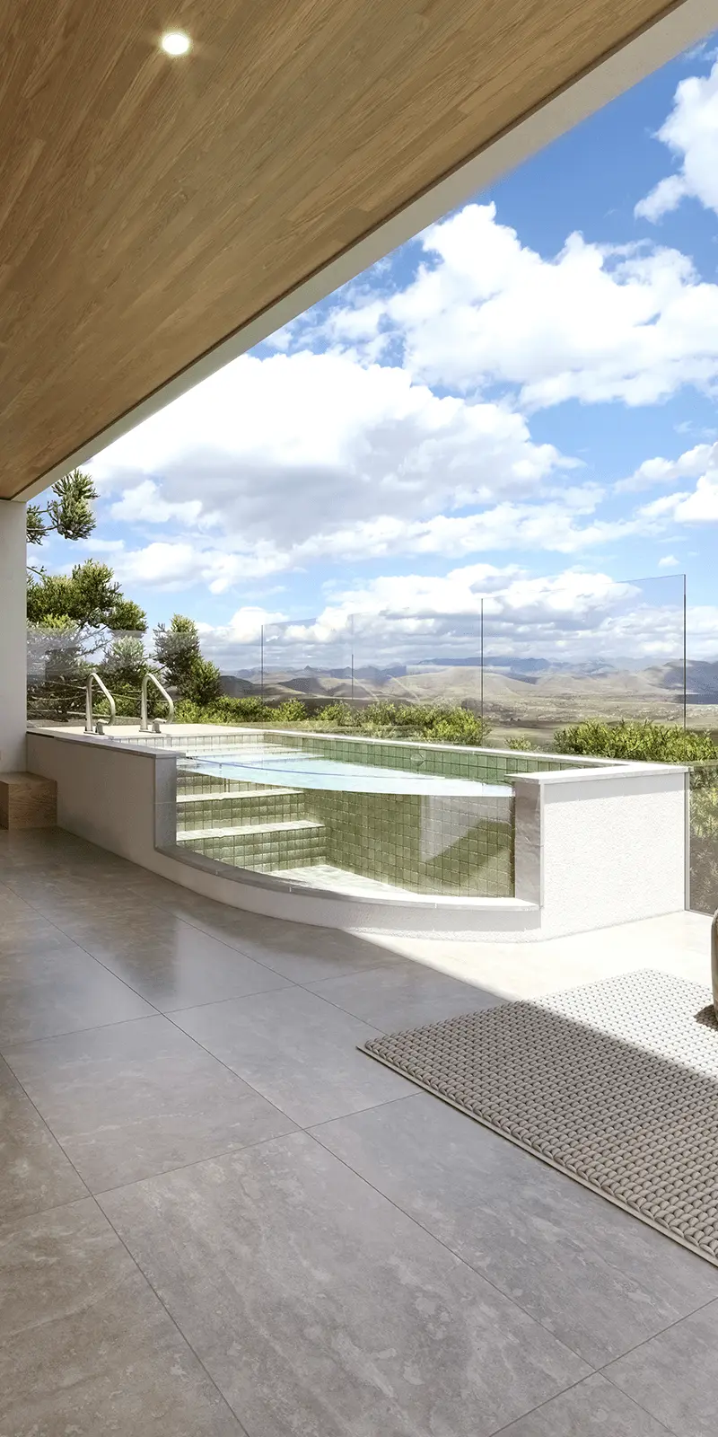 A tiled spa with a curved glass wall.