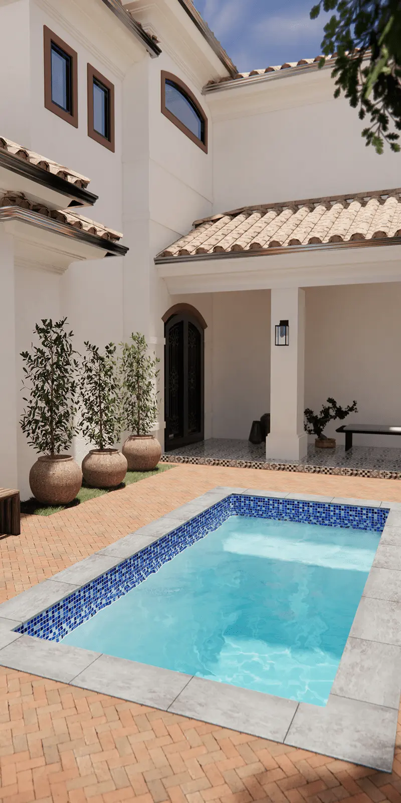 This fiberglass pool with waterline porcelain tiles adds elegance with a refined touch.